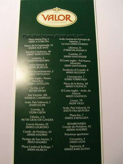 So, yesterday when we went to Villajoyosa’s Valor chocolate “restaurant”, I took some mouthwatering pictures for you. Also have a look at the backside of leaflet i picked up, which lists all Valor outlets in Spain. You literally find them all over Spain.